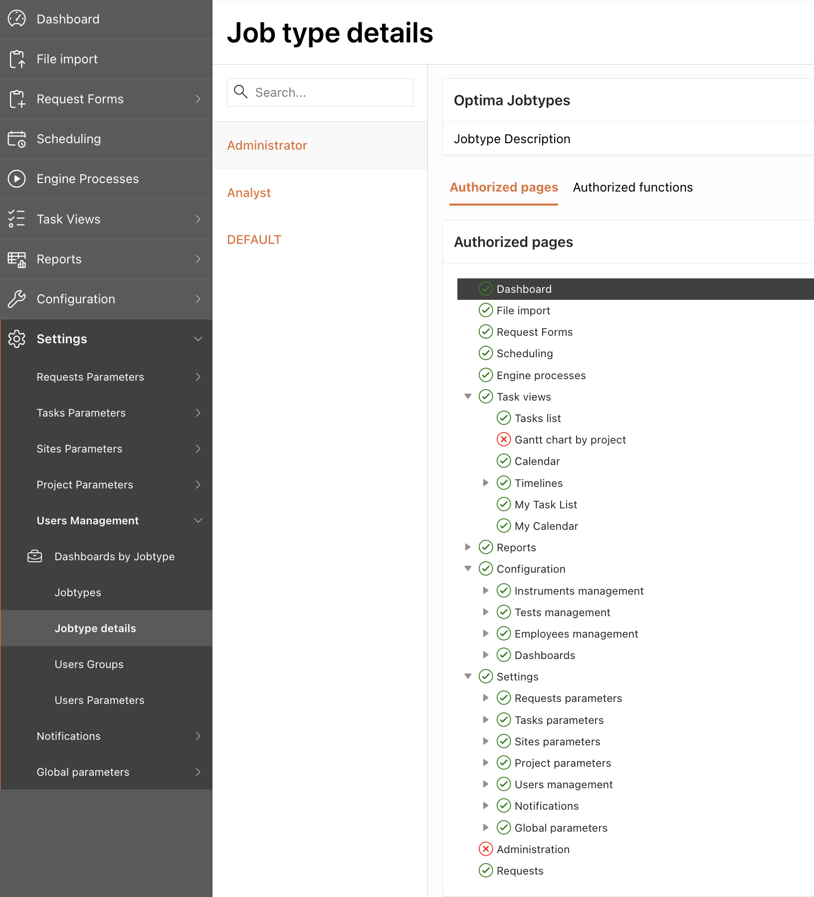 The Jobtype details page is composed of two lists: AUTHORIZED PAGES & AUTHORIZED FUNCTIONS