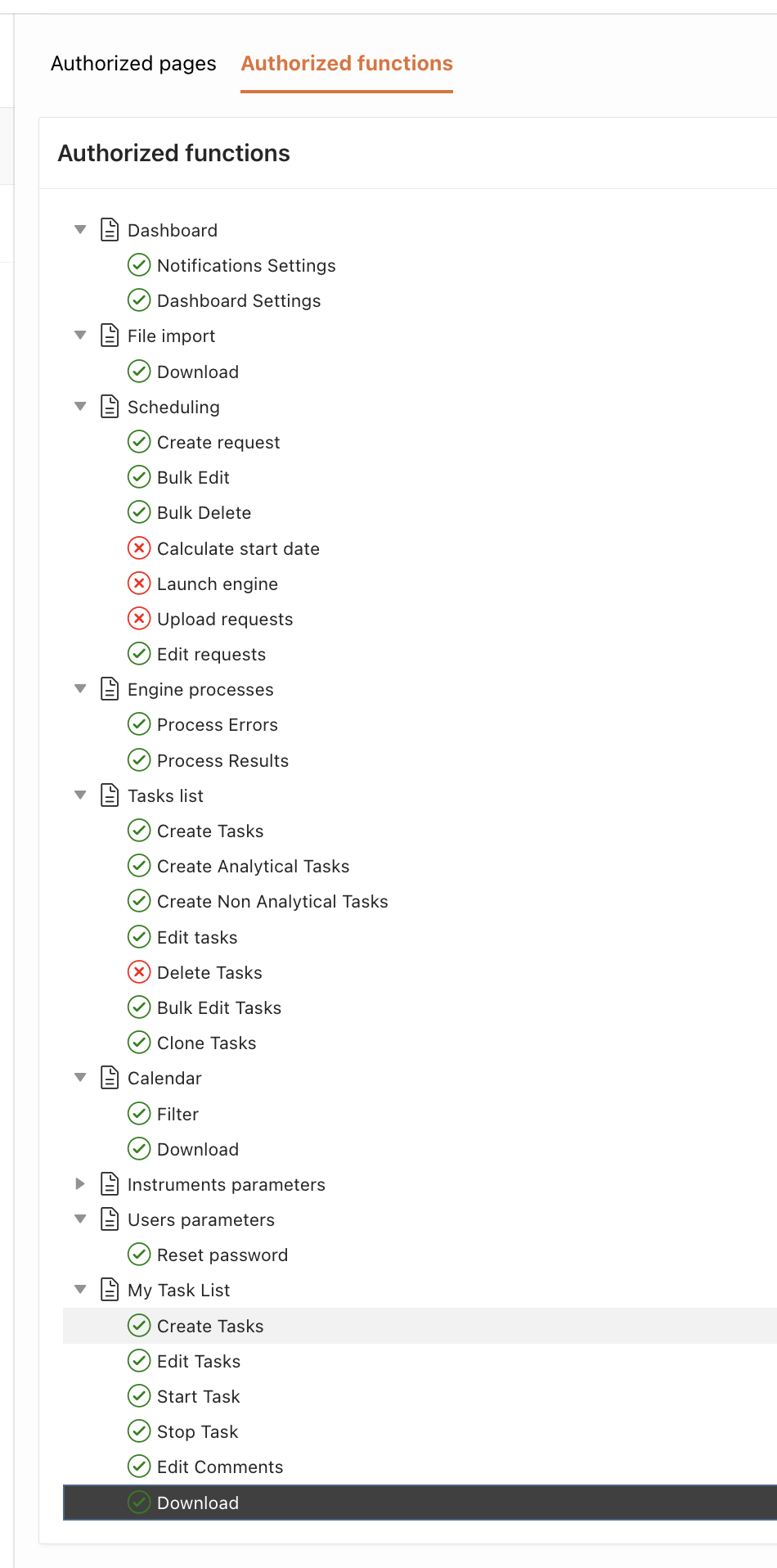 The functions available are the ones associated to configuring their dashboard and notifications, creating non-analytical tasks in their agenda, use of the start, stop buttons and comment function in My Task List.
