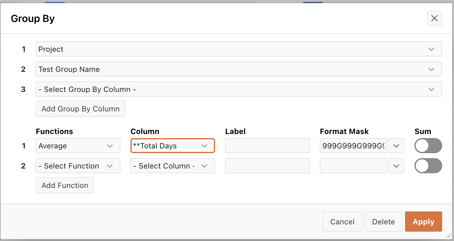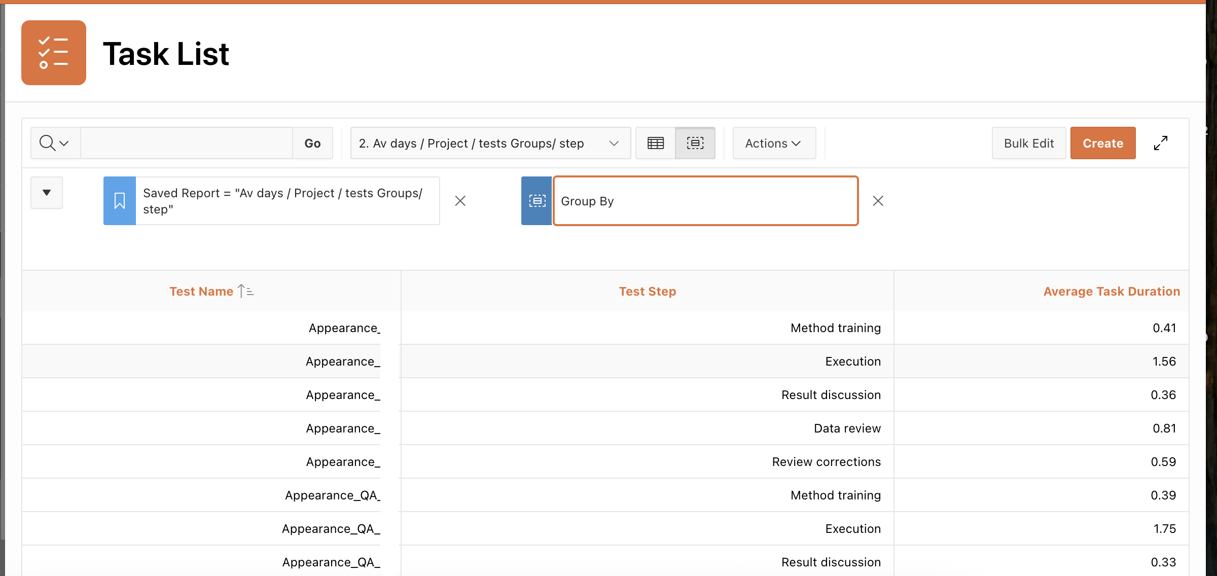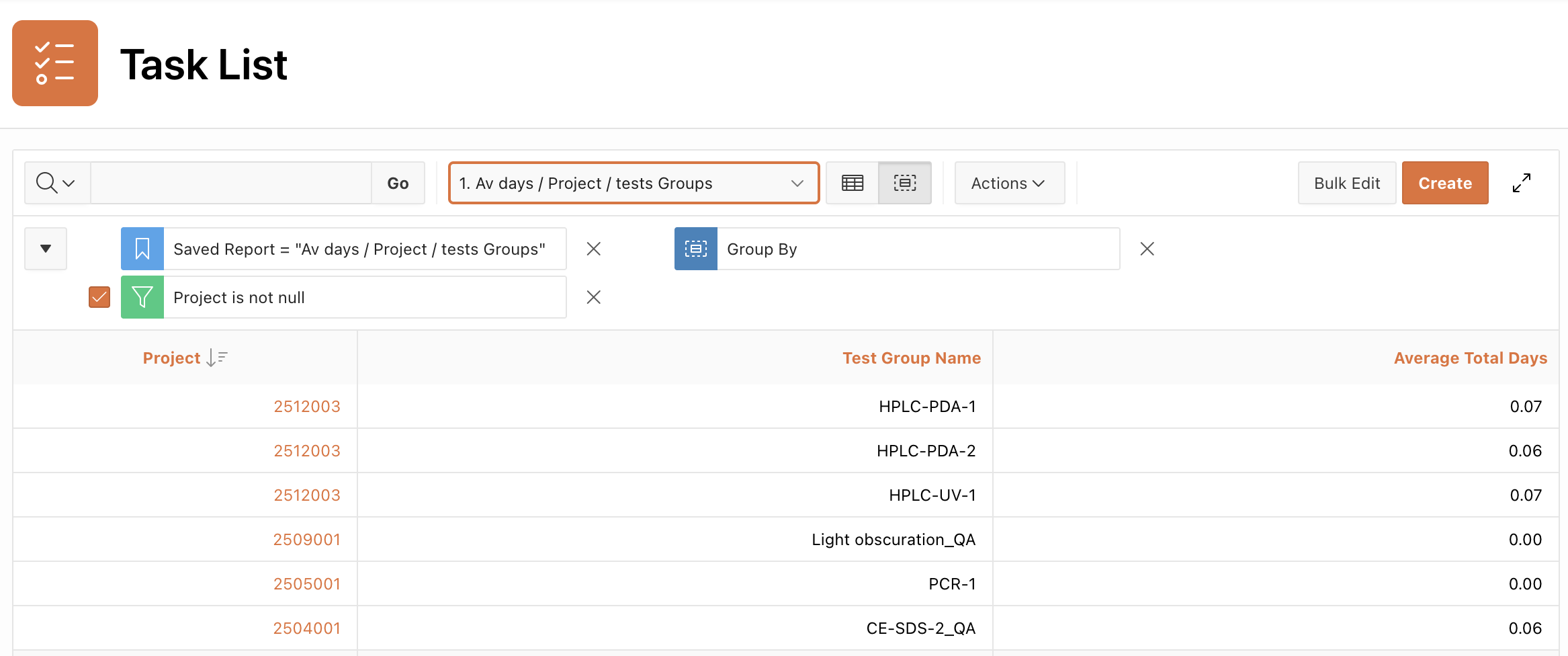 Example: Group your Projects / Tests Groups and get the Average of Total days
