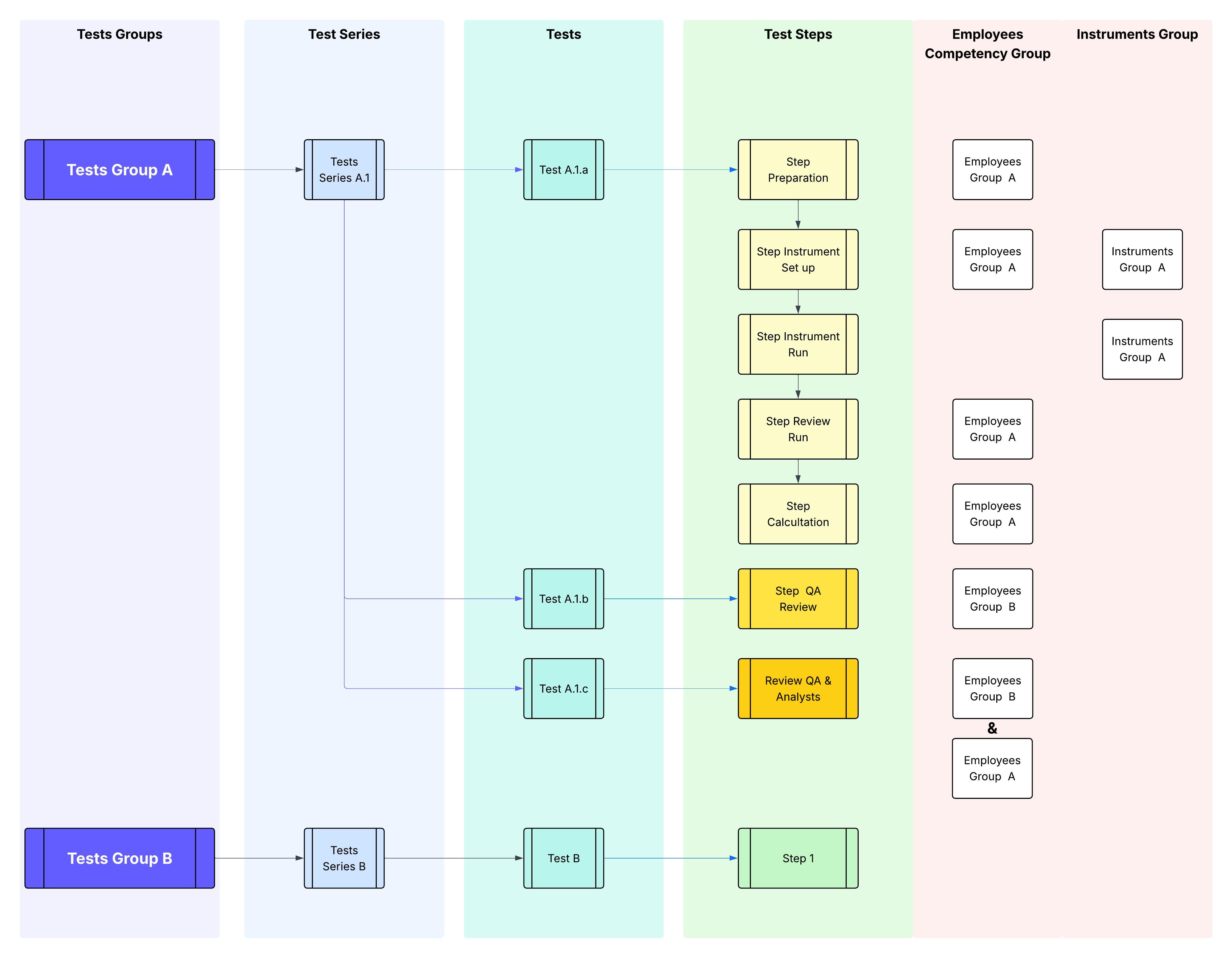An entire Test can be assigned to the same person/instrument. Therefore, each step should be assigned to the same competence/instrument groups.