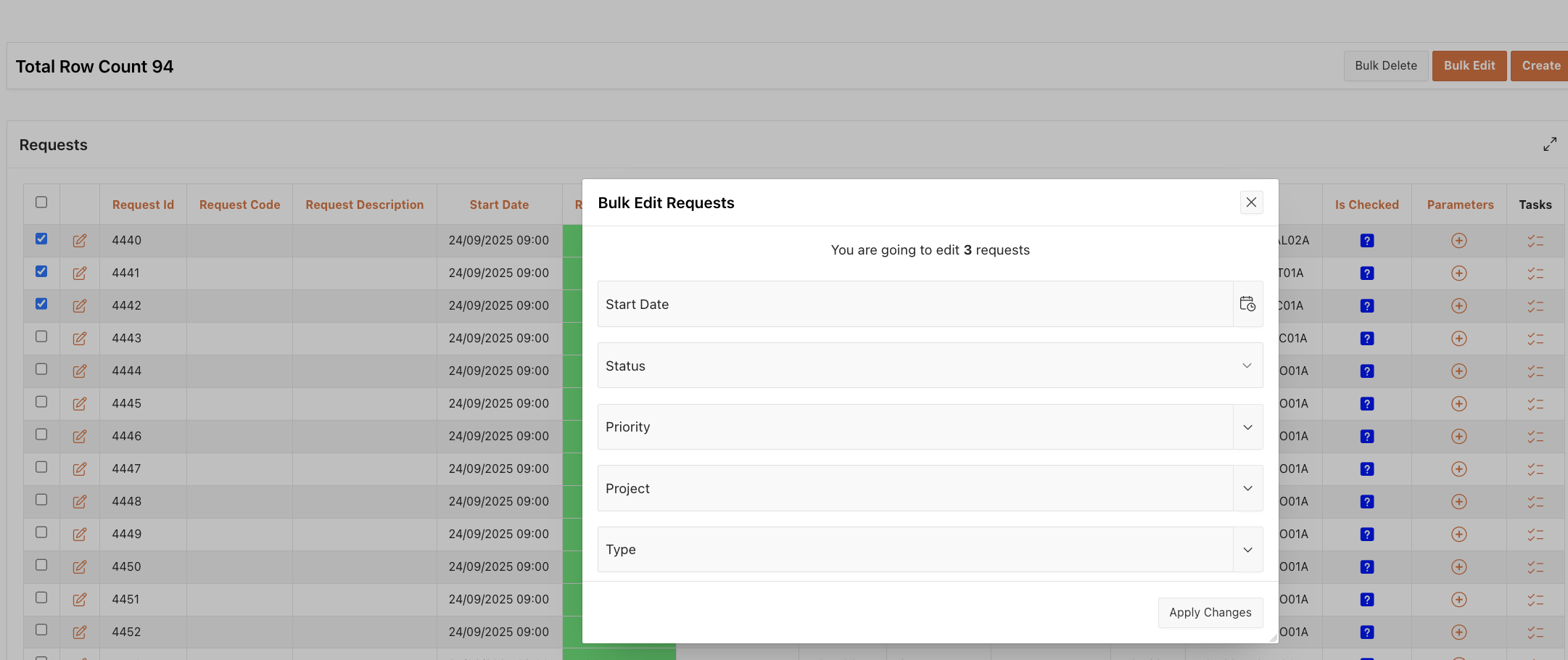 The Build Edit button allows you to edit multiple selected request lines at once for a series of parameters.