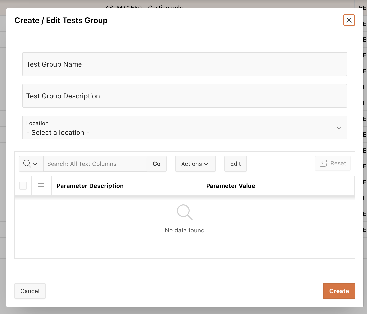 Parameters | The custom parameters defined at the Tests Group level can be found here. When no parameters have been set, the corresponding field is inactive. |